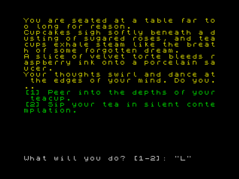 A very short and strange text adventure/interactive fiction game inspired by Alice in Wonderland.